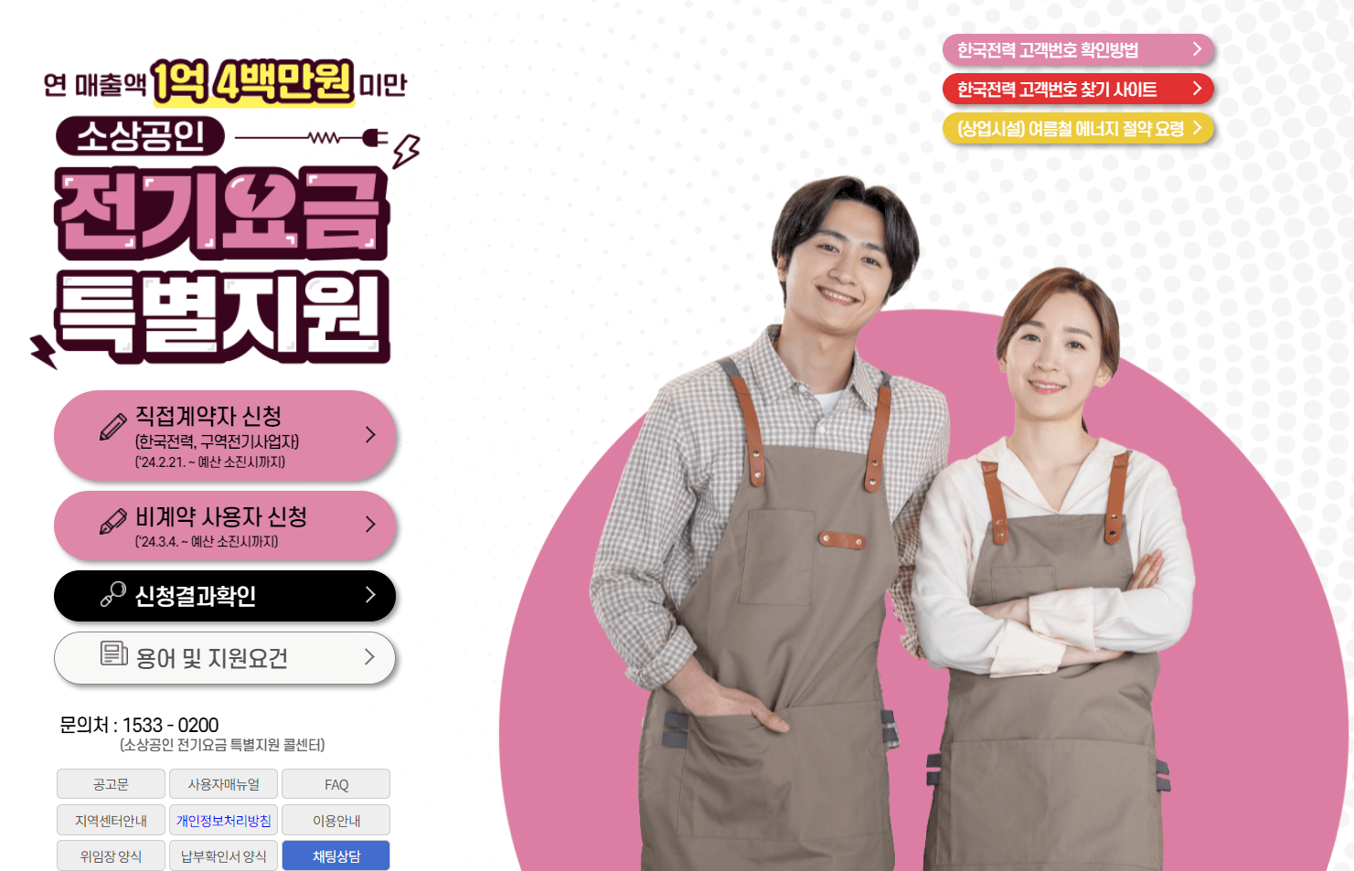 1차 공고일 기준 (24년 2월 15일) 활동중, 연매출액 1억 400만원 미만, 사업장용 전기요금을 부담하는 개인 혹은 법인사업자여야 합니다. 지원금액은 최대 20만원입니다.